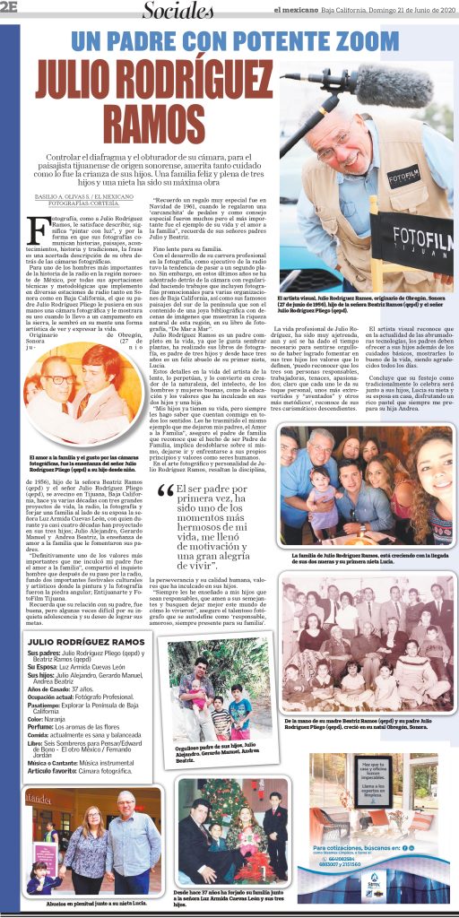»Controlar el diafragma y el obturador de su cámara, para el paisajista tijuanense de origen sonorense , amerita tanto cuidado como lo fue la crianza de sus hijos. Una familia feliz y plena de tres hijos y una nieta ha sido su máxima obra».